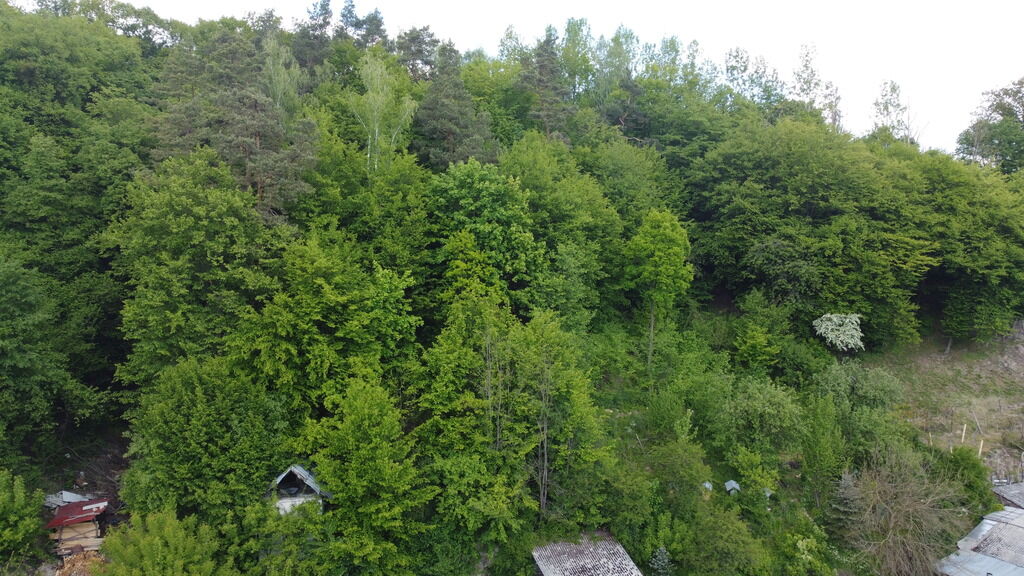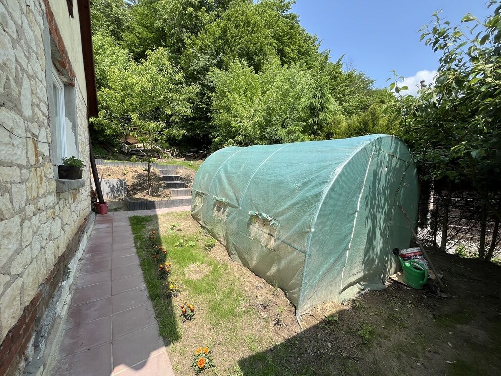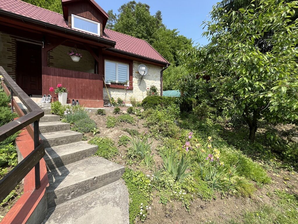 posesji przylega zalesiony teren mocno wznoszący się do góry z